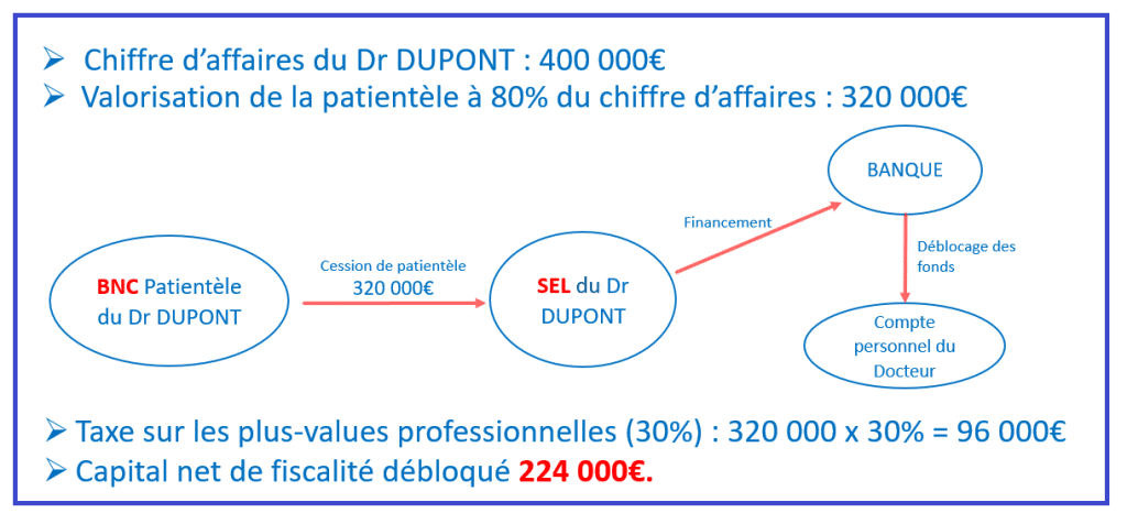 Il faut savoir qu’une SEL peut être créée soit avec apport personnel, soit avec valorisation et rachat de la patientèle du praticien. En ce qui concerne le Docteur DUPONT, nous avons valorisé la patientèle à 320 000 € (soit 80 % du chiffre d’affaires).